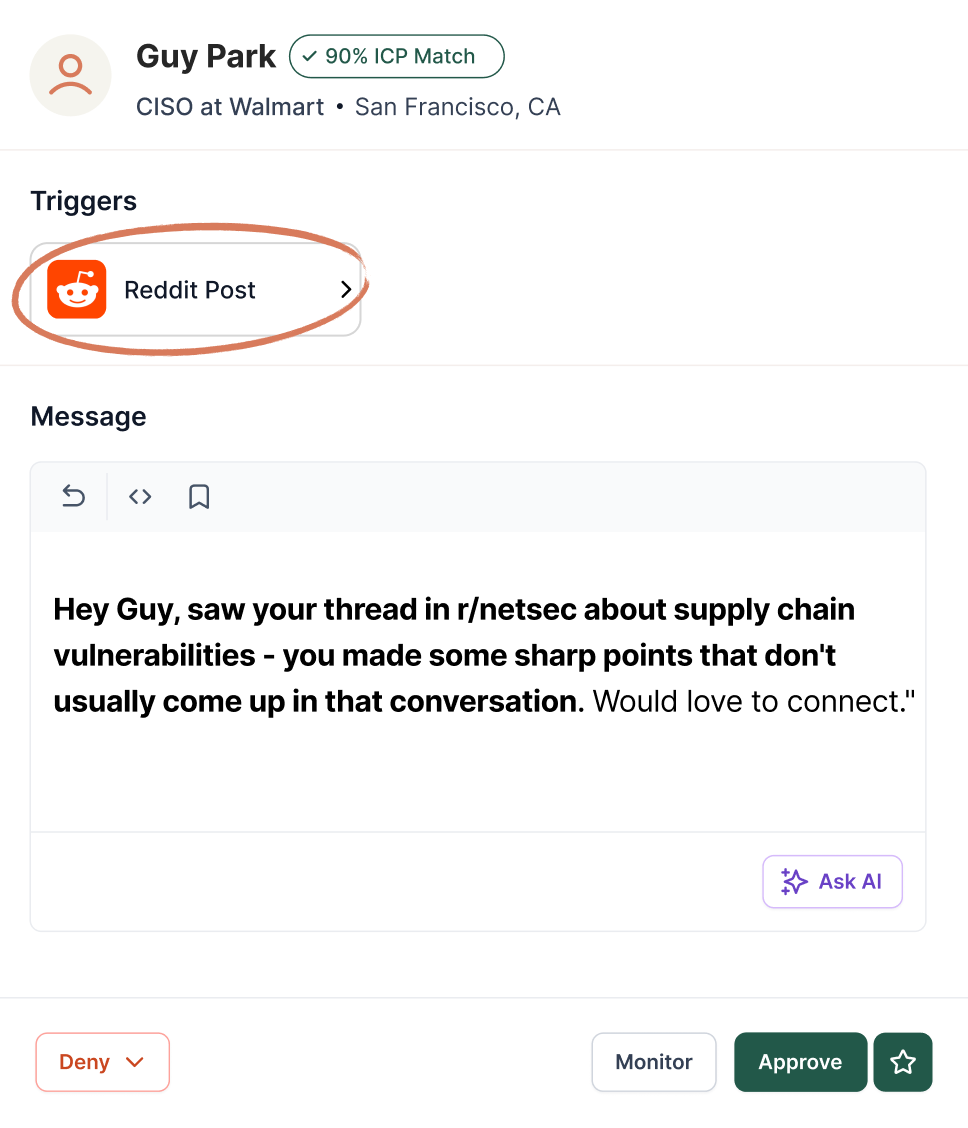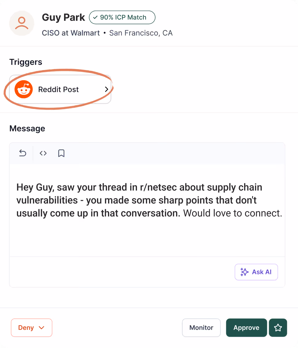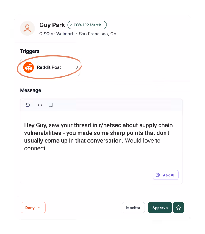 Every prospect is part of a campaign tailored to their ICP segment, so messages feel personal,not generic. Outreach happens where prospects are already active - LinkedIn, Reddit, X, and more. You stay in control.