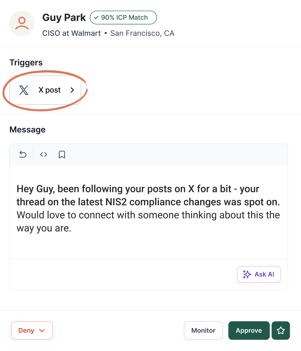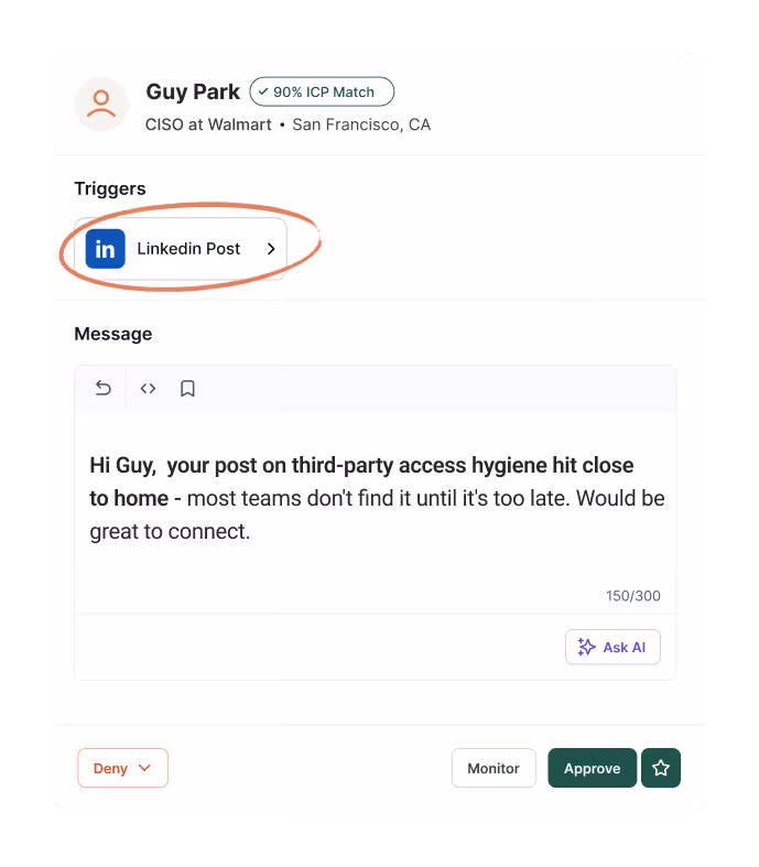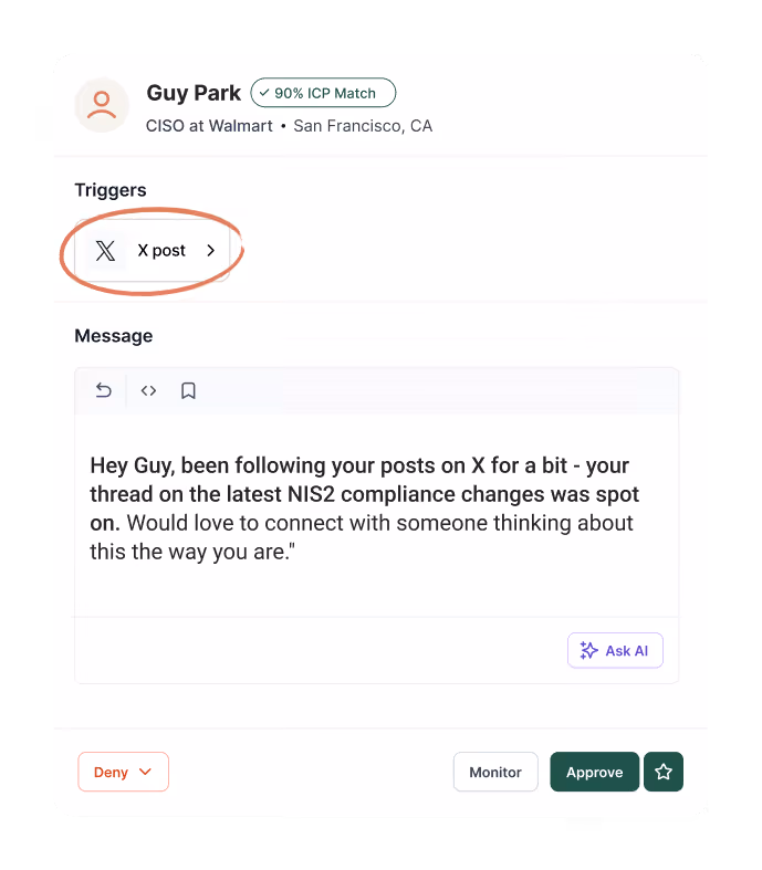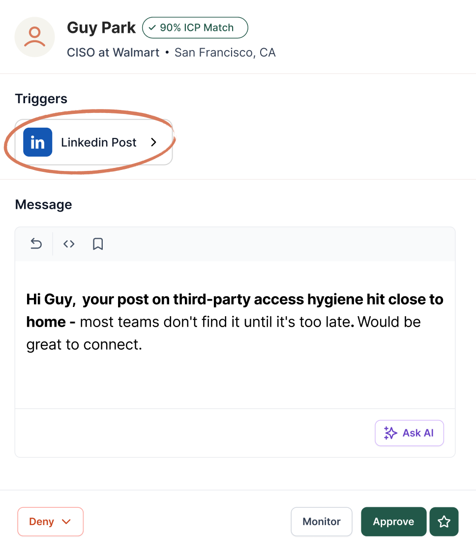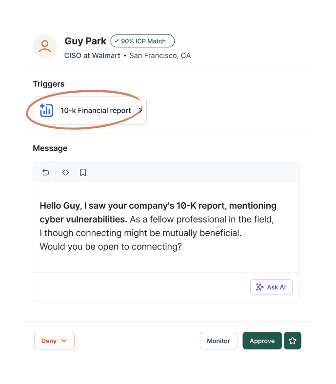 As relevant triggers appear, Spear suggestsprospects worth reaching - based on intent and context. You approve or deny.