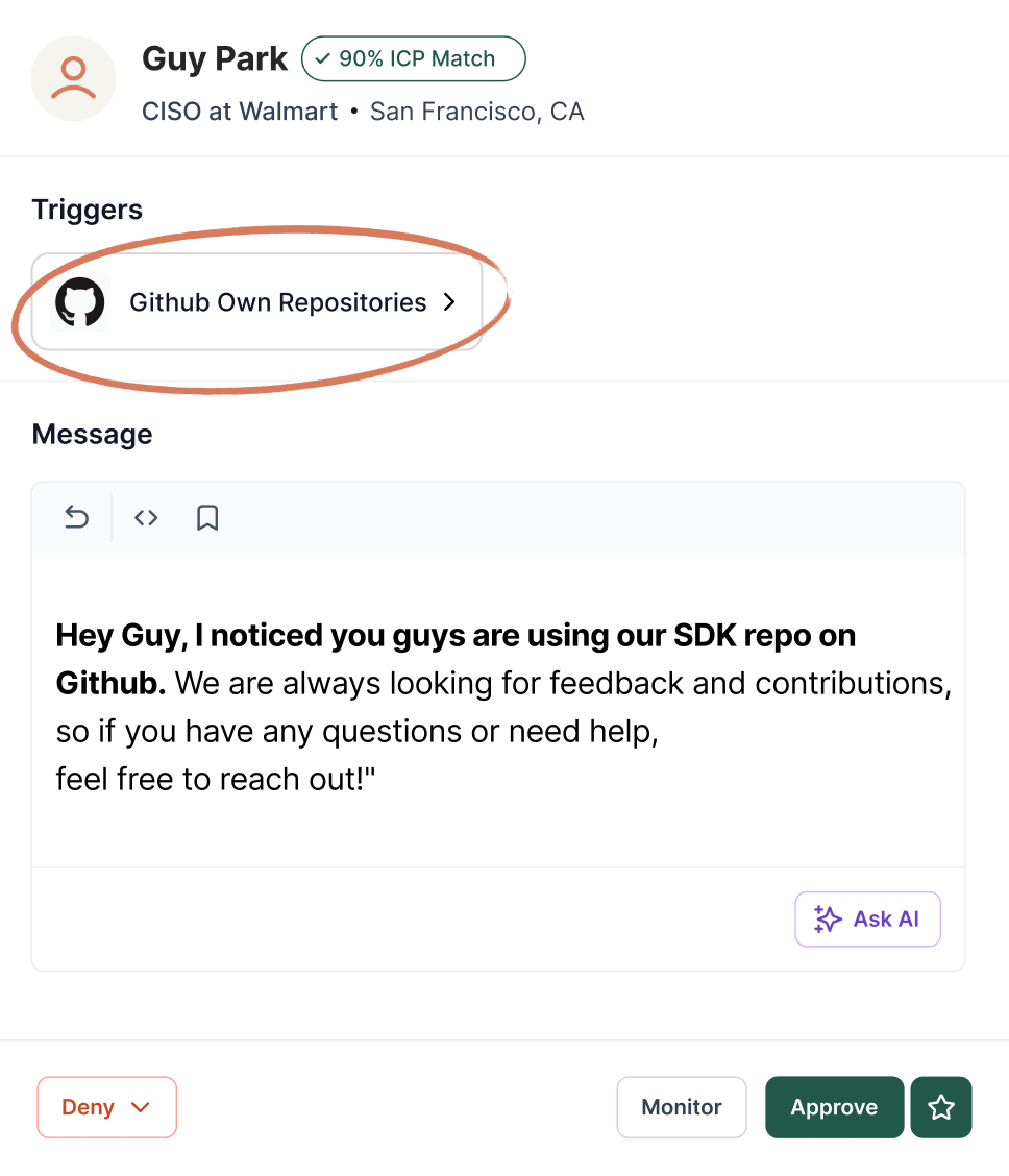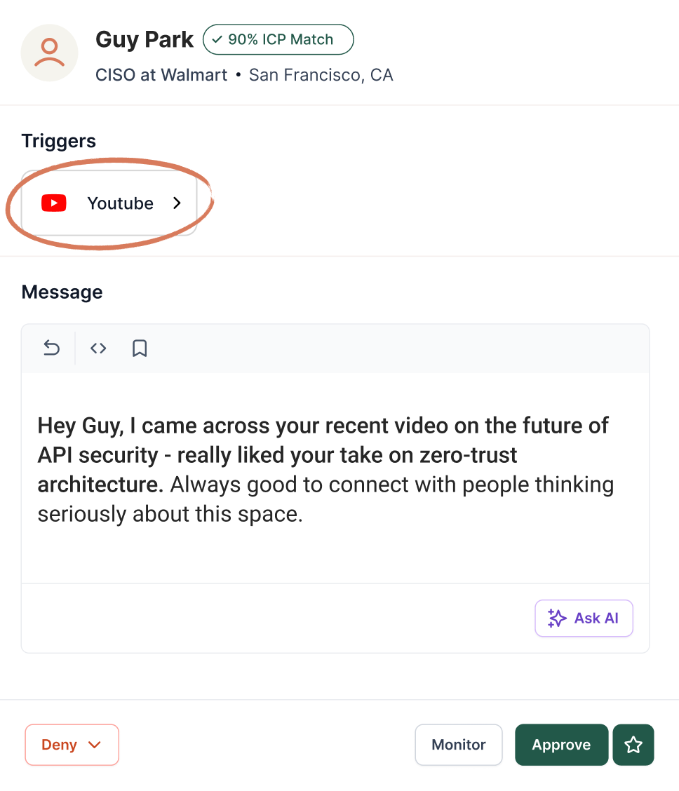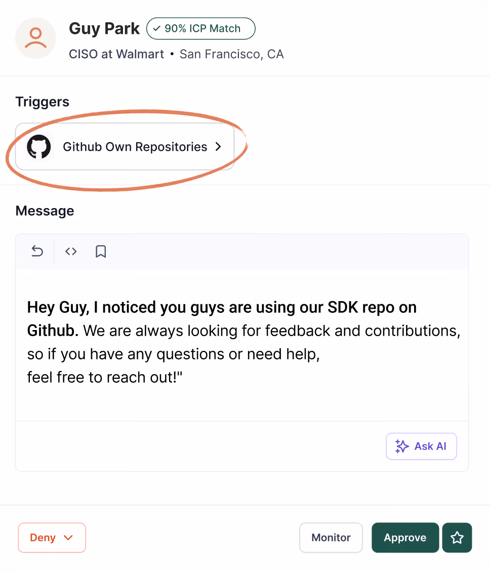 As relevant triggers appear, Spear suggestsprospects worth reaching - based on intent and context. You approve or deny.