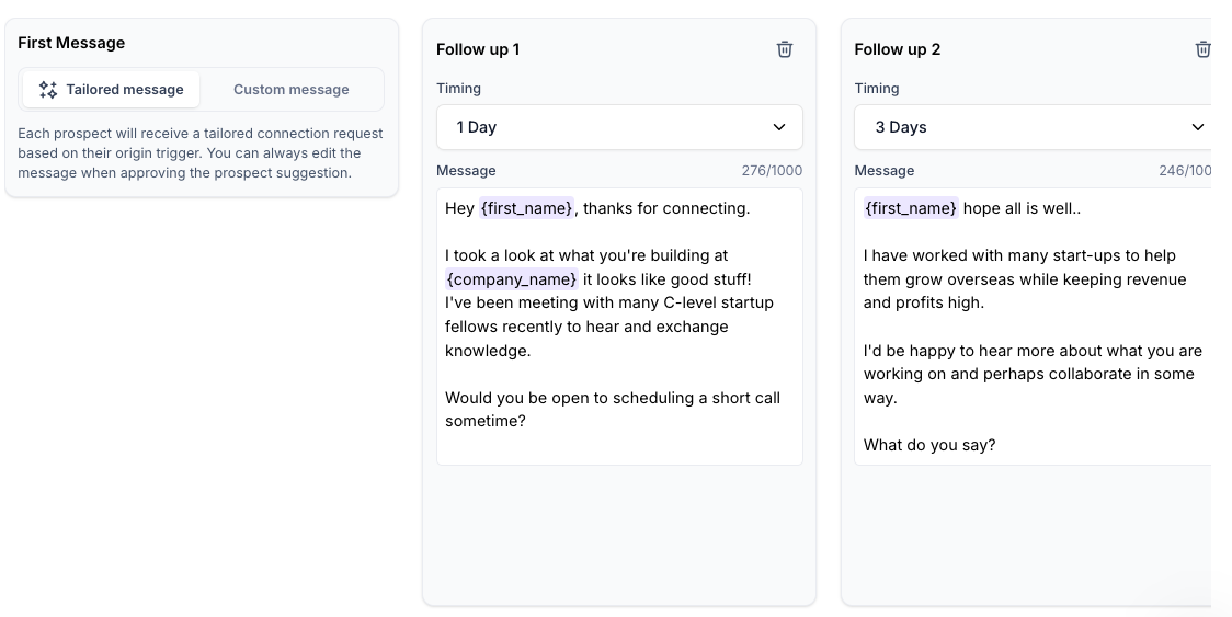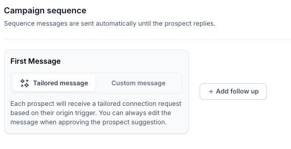 - Tailored message: If you select this, each prospect will receive a tailored connection request based on their origin trigger.