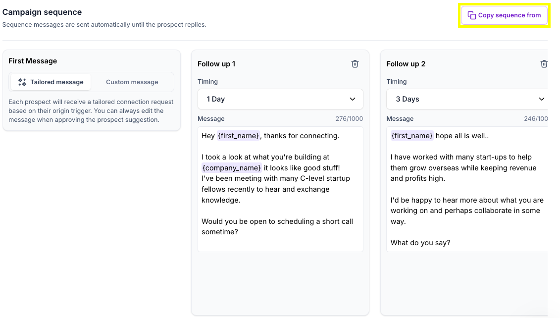 💡 Tip: Want to reuse a winning sequence? Click 'Copy from' to pull the sequence from any active campaign.